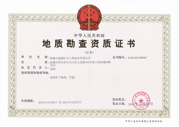 新疆天地源地勘公司成立于2004年,歷經十余年的發展,現持有地質勘查甲級資質和ISO9001:2008質量管理體系認證證書。